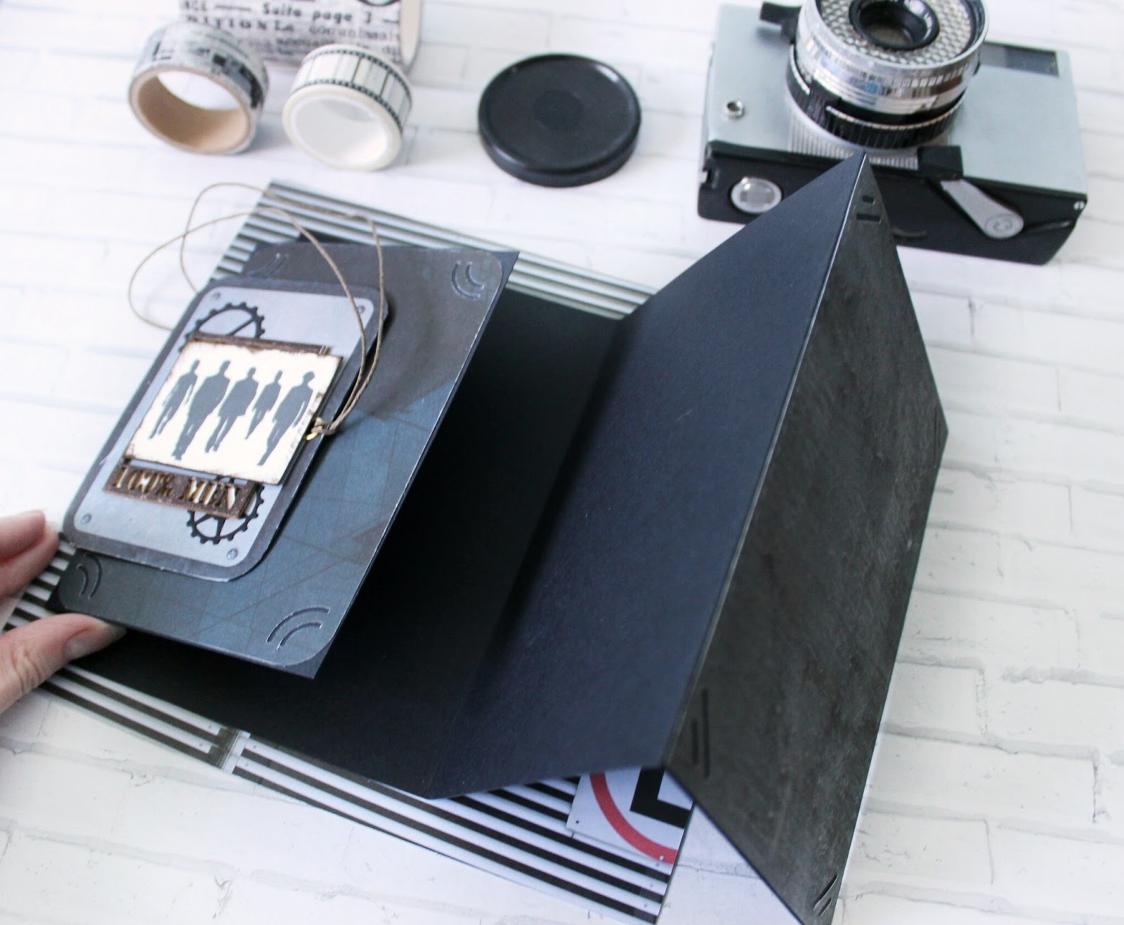 Второй этап - второй разворот моего альбомчика! Альбом получается контрастным, с объемными элементами. "Секретик" - в большой подложке на 5 фотографий, и кармашке под ней - для карточек. А двусторонний тег вытаскивается из правой странички и вместит, при желании, ни одну фотографию.