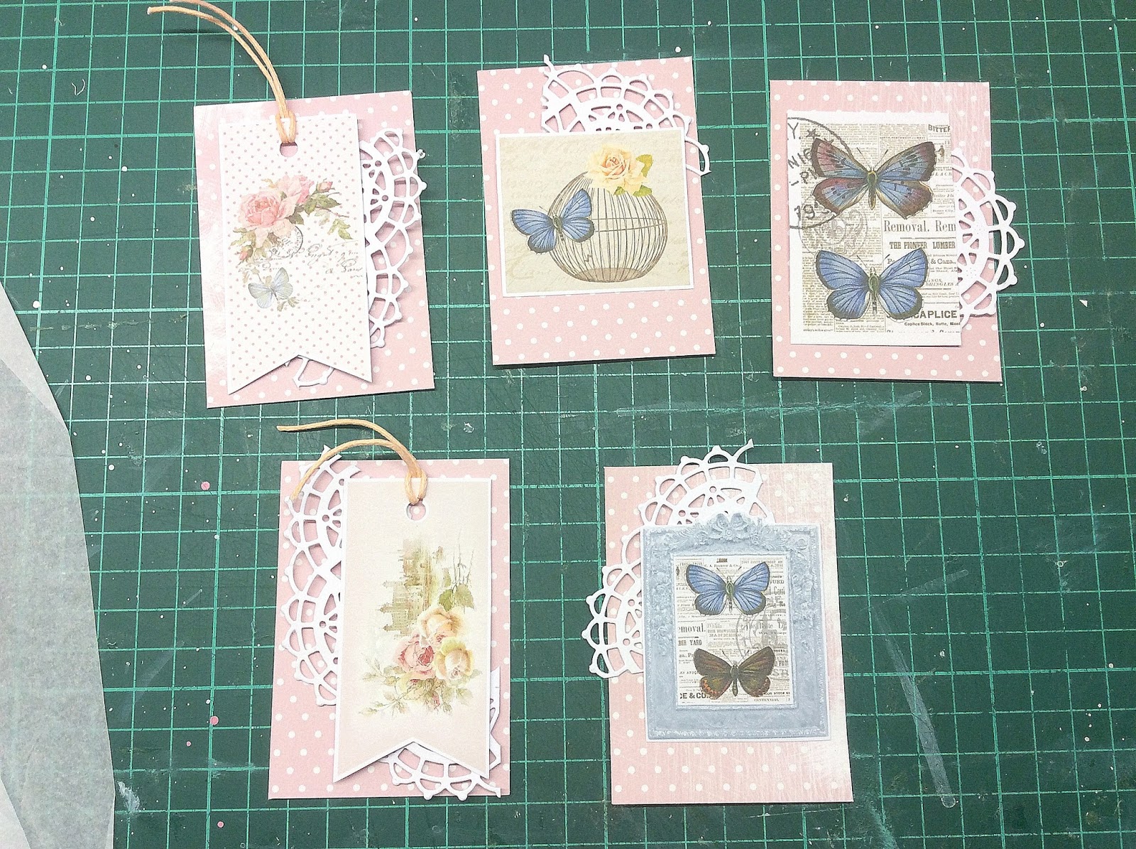 А теперь начнем. В работе буду использовать обрезки коллекции от ScrapBerry's "Бабочки", крафт-картон, стразы, машинную строчку, вырубку, отштамповки, бумагу тишью и клей) Моя серия будет состоять из пяти карточек и называется она "Весенняя".