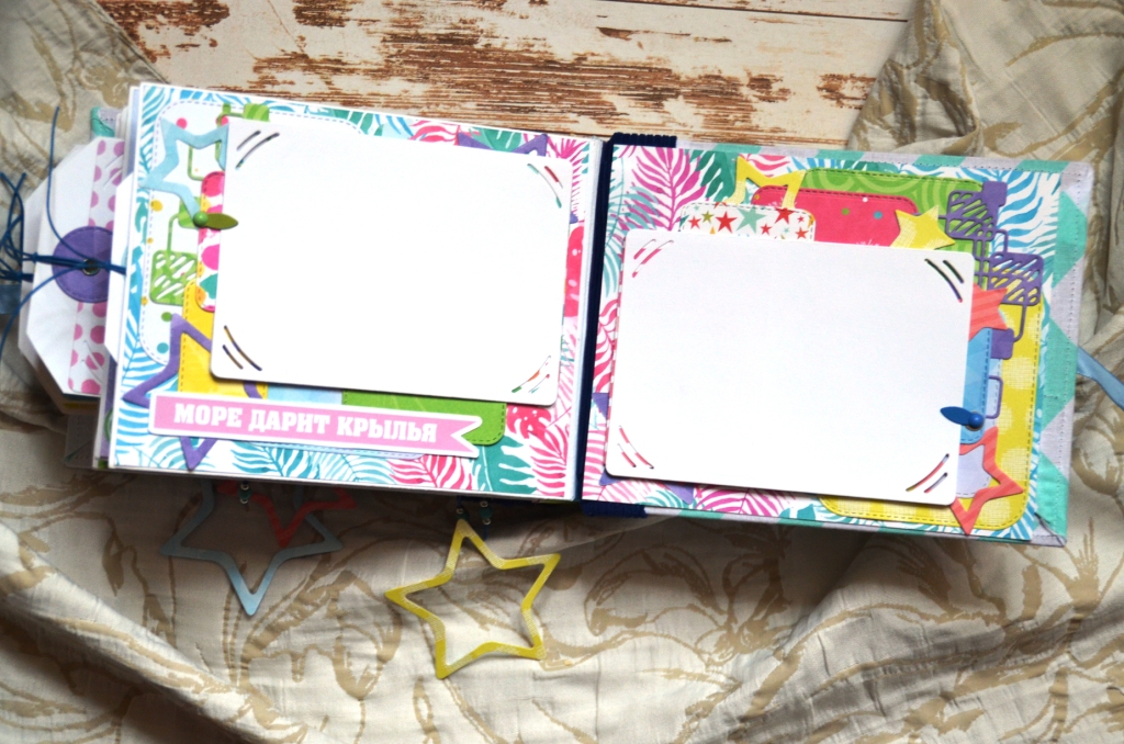 Кстати, каждая страница имеет кармашек, внутри которого вставлен большой тег с разноцветными подложками для фото. Таким образом, в мой альбом вмещается аж 34 фотки