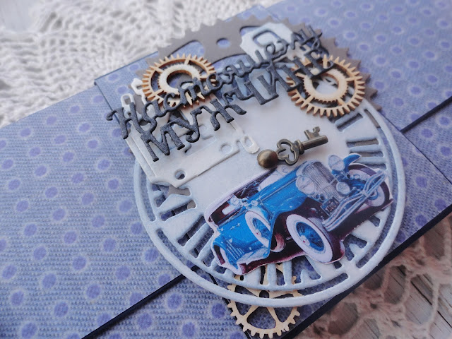 В конверте я использовала строчку: цифра - шестеренка - металл. В основе дизайнерский картон, бумага от K&Company (очень старенькие листы), вырубка, чипборд, металлические украшения, картинка. Немного затонировала Дистрессом.